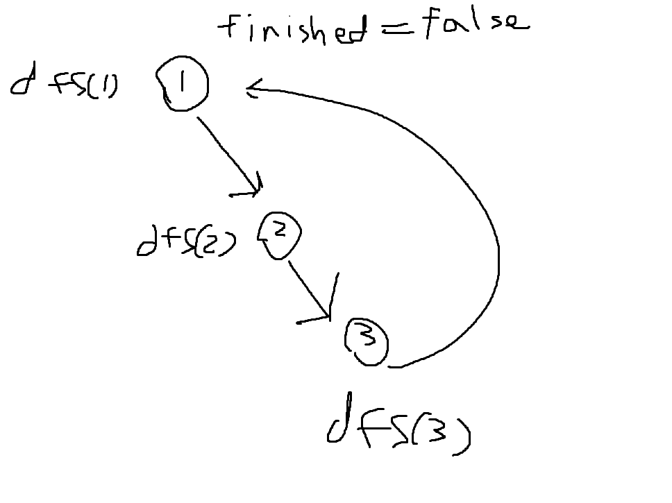 이때 1번 노드에 방문은 한 상태지만 dfs(1)의 호출은 아직 끝나지 않은 상태이므로 finished[1] == false이며 back edge 판정이 되고 이 그래프는 사이클을 가짐을 알 수 있다.